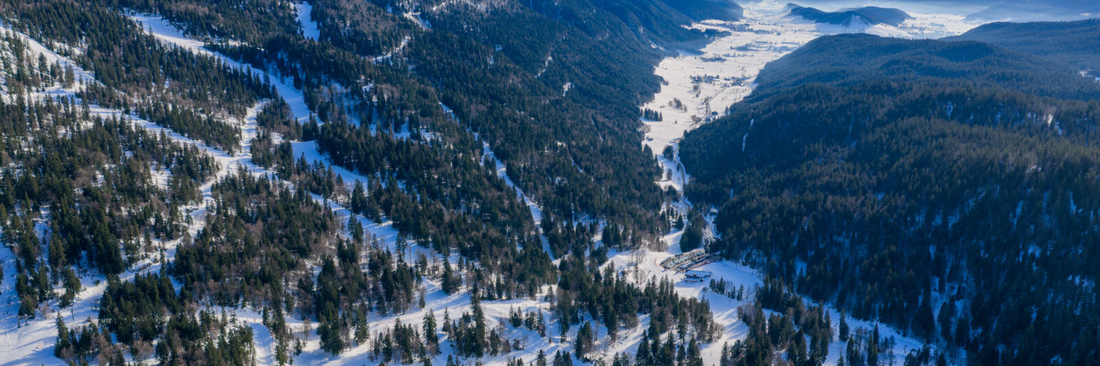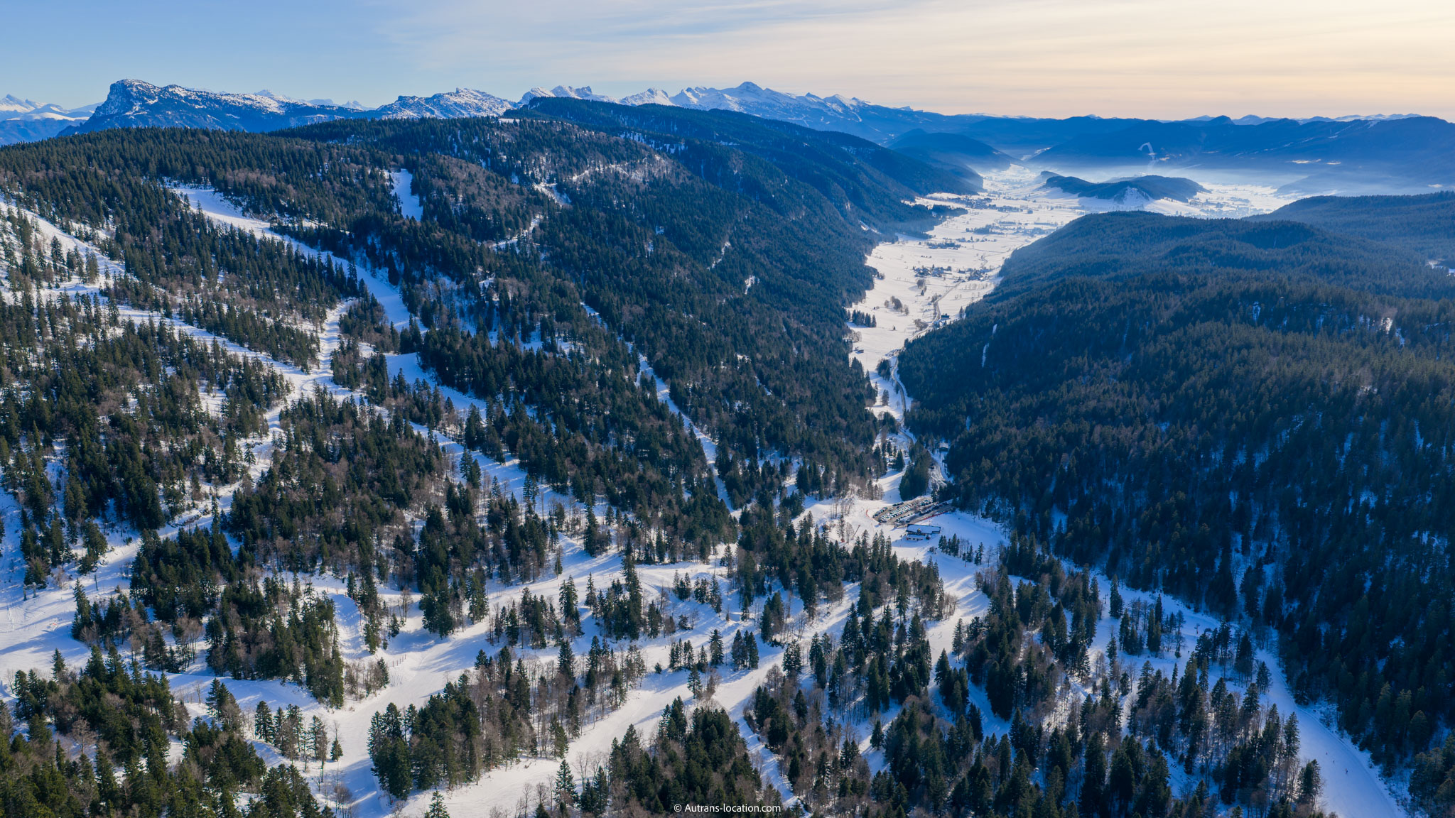 Le domaine de ski Alpin de la Sure avec le village d’Autrans au fond