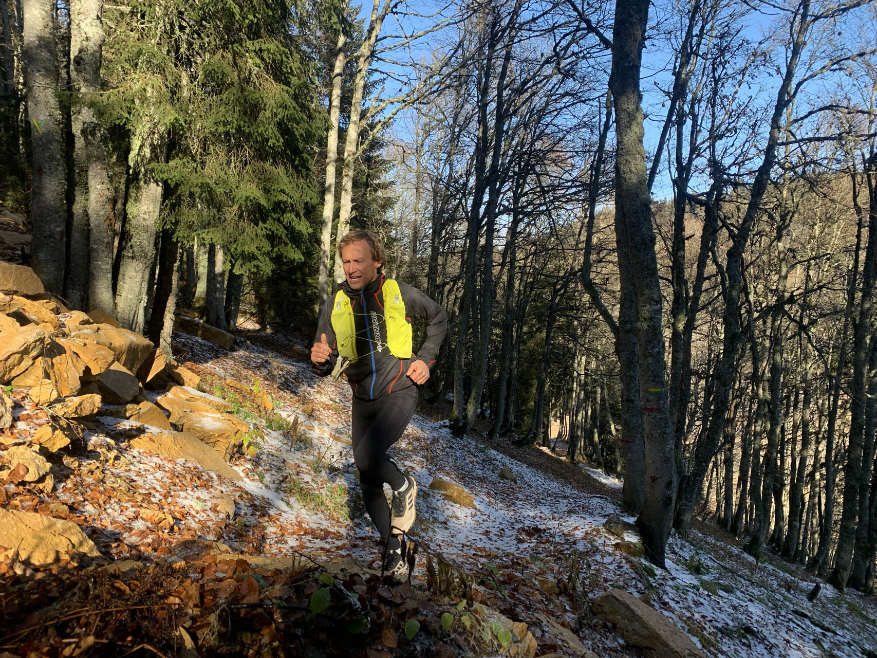 La neige peut bien évidemment être de la partie. Soyez prévoyant dans ce cas avec l’équipement adapté. Chaussures adaptées, chaines ou chaussures à picot, vêtements thermiques. Ne courrez pas en short. Adaptez votre équipement. Pensez également à la blessure qui vous ralentirait. une tenue chaude reste adaptée dans les rafales de vent ou le froid à 1200 mètres d’altitude.