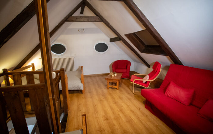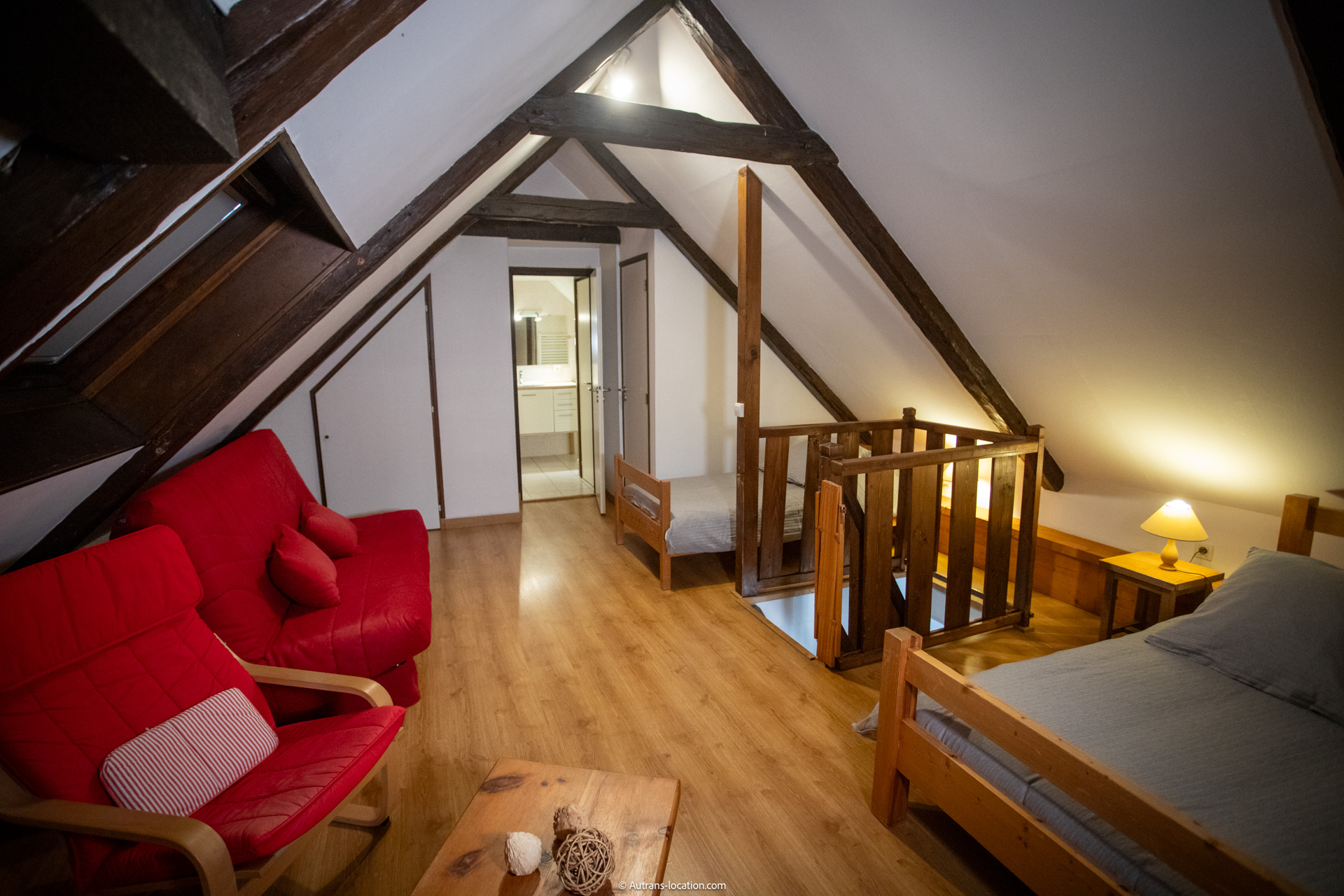 Chambre ouverte à l'étage équipée d'un lit double (140X190) + un lit simple (90/190) et un clic-clac (couchage double 130/190).
