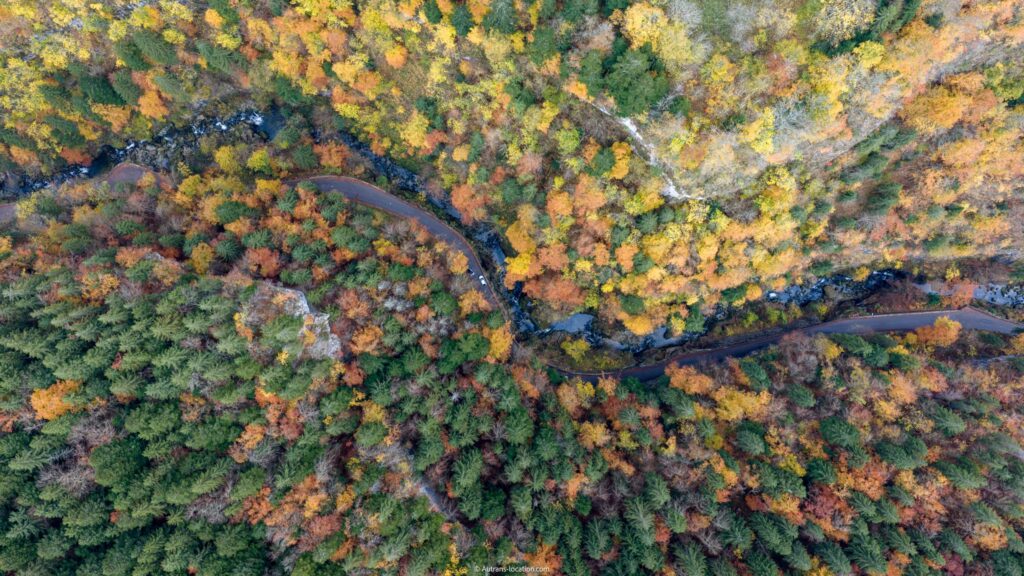 Les gorges, partiellement boisées, préservent une atmosphère de fraîcheur lorsque les températures montent. À l’inverse, l’hiver dévoile la structure du vallon et laisse entrer une lumière franche entre les troncs, soulignant le contraste entre les berges enneigées et le courant qui se faufile.